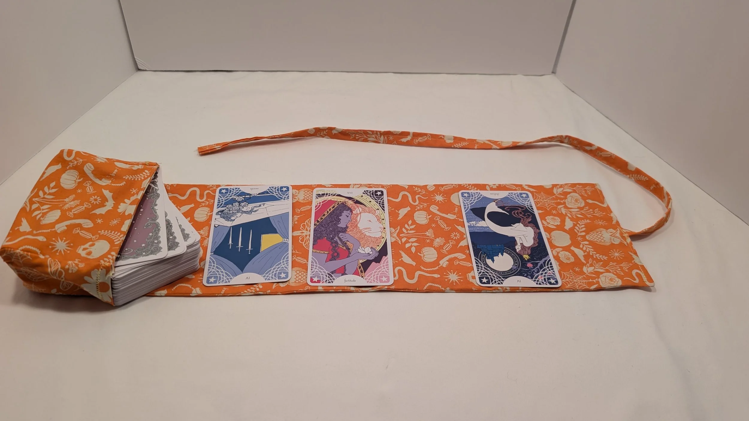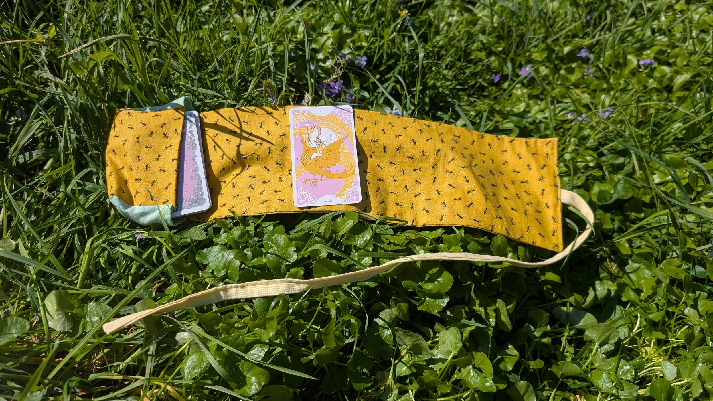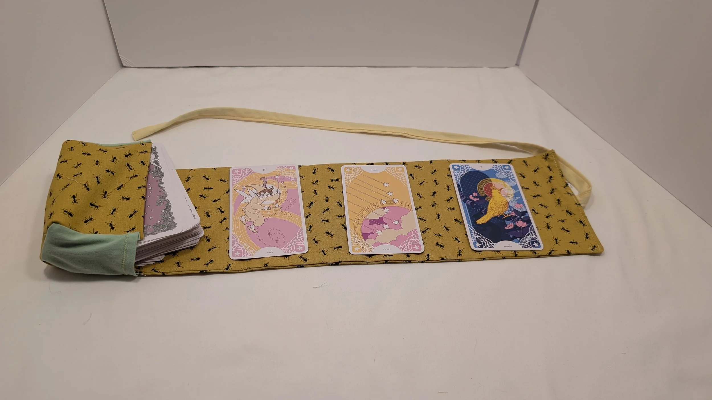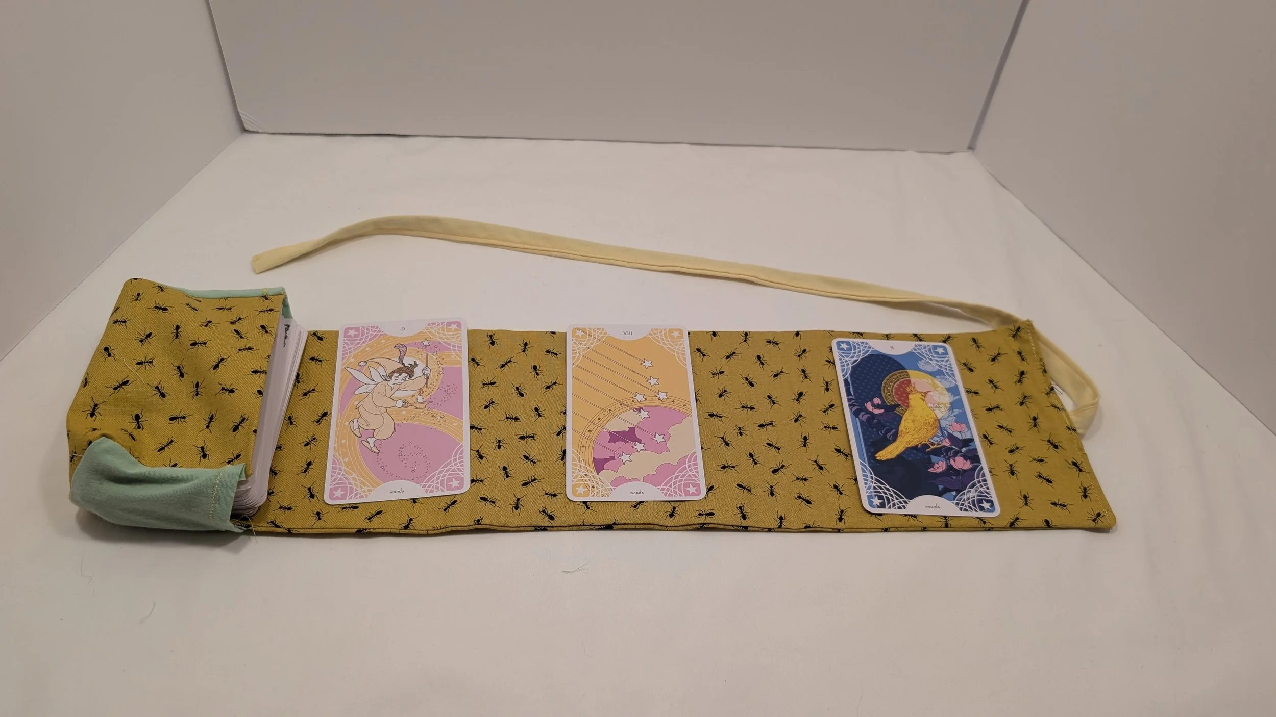 This standard size tarot deck holder is made of a fun yellow ant pattern on cotton. It features pastel cotton accent fabric. The deck holder has both a pocket to hold your deck and a space for a small spread. This deck holder is made to fit almost all standard size tarot or oracle decks.