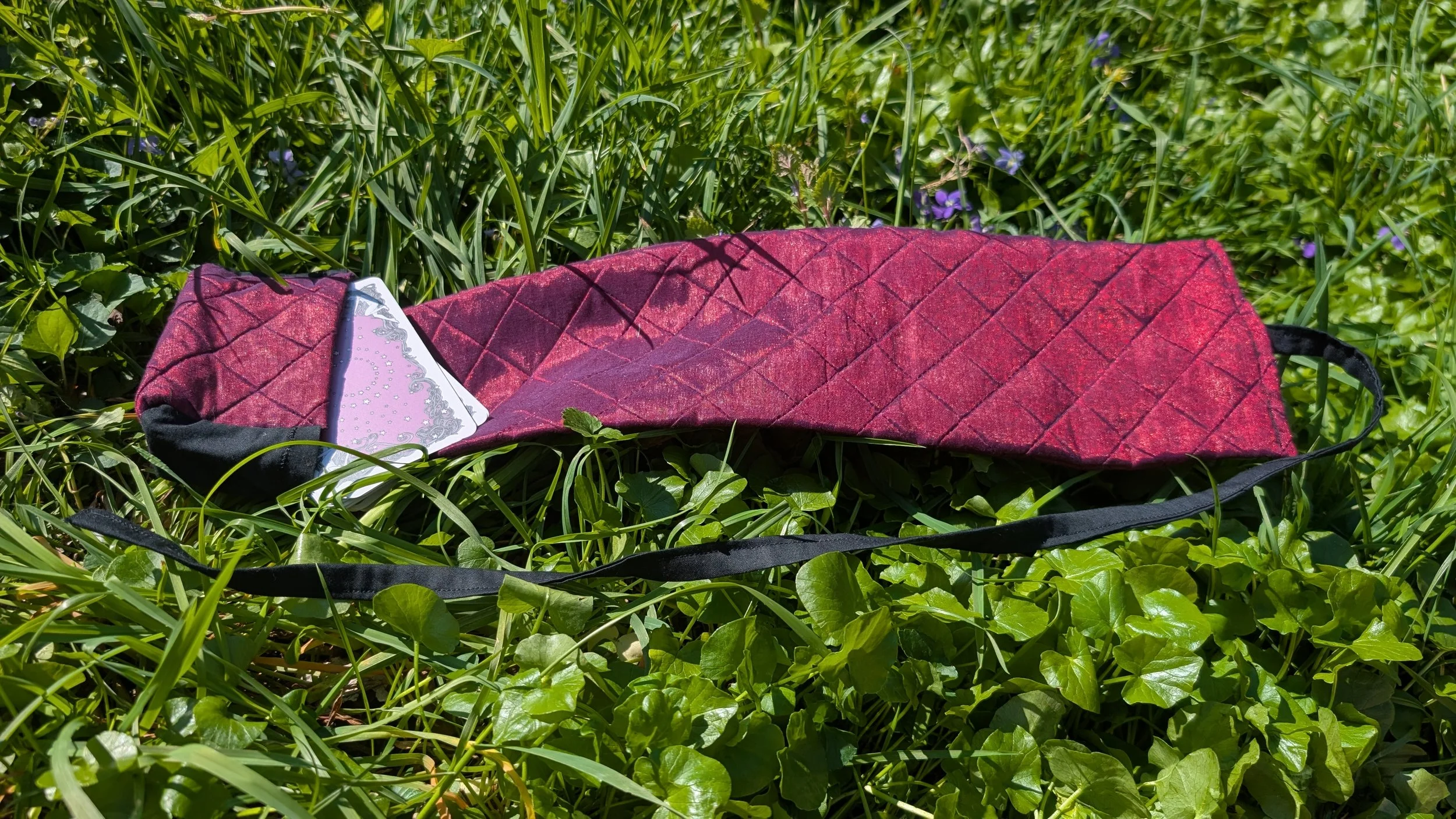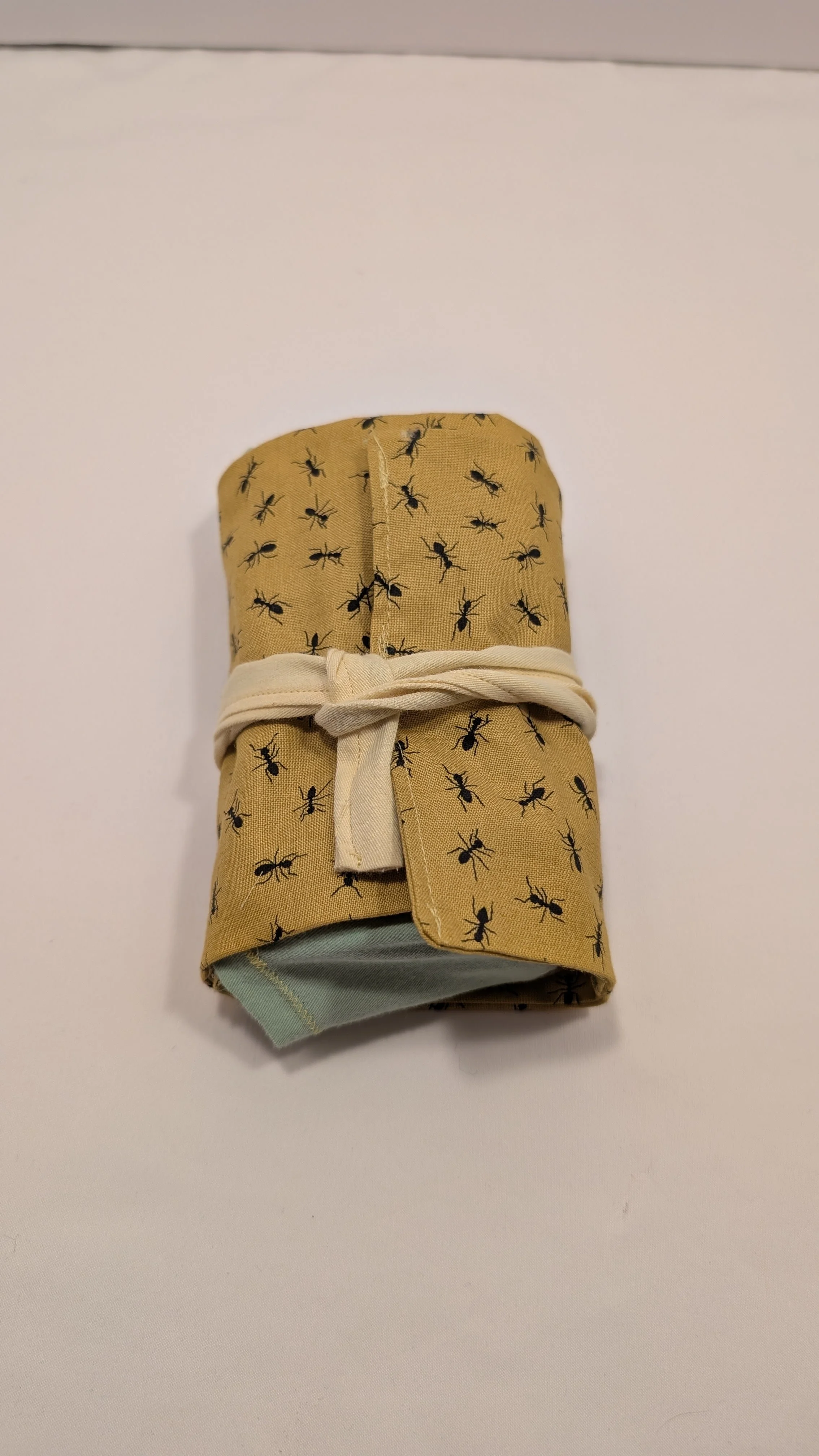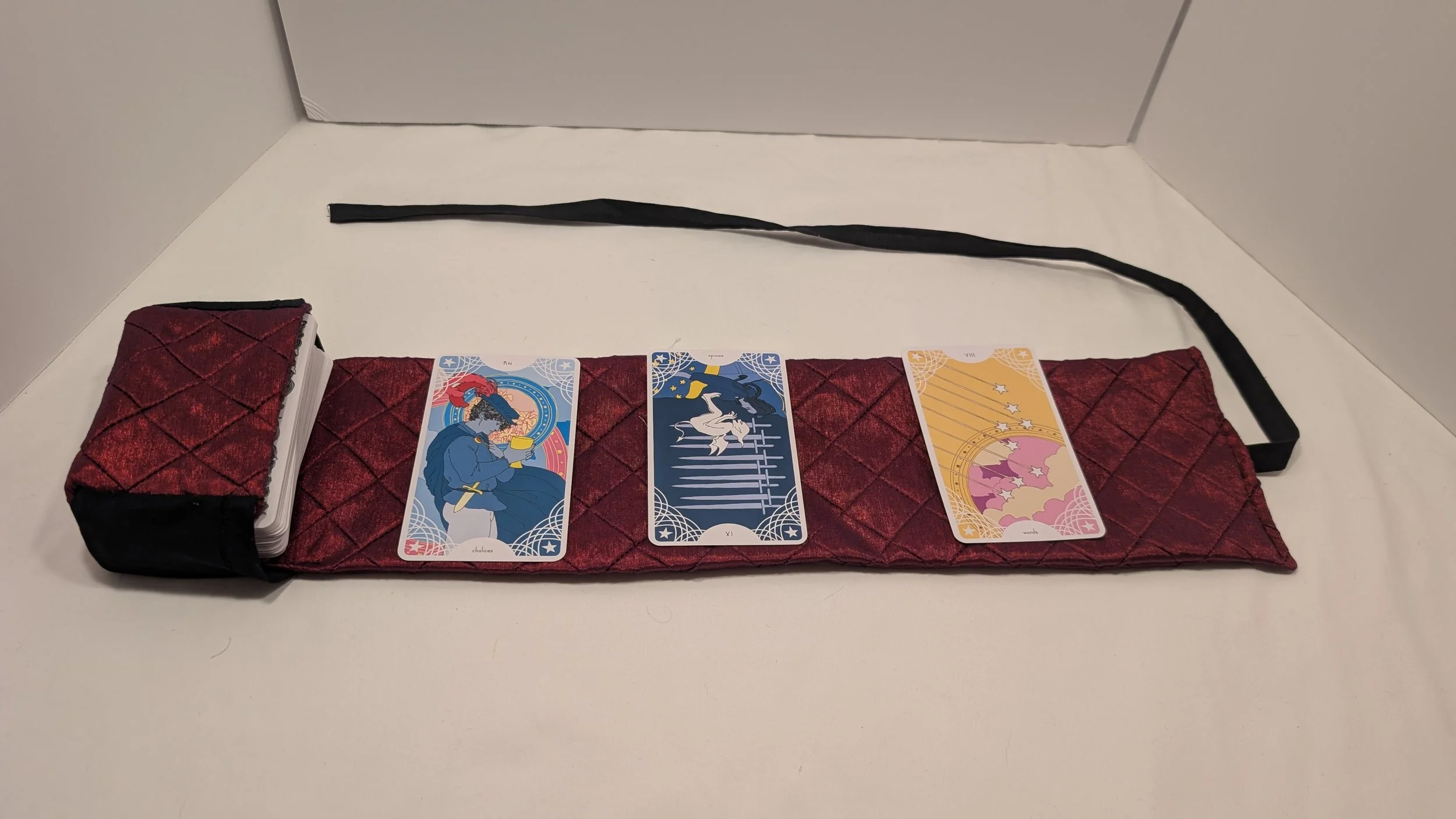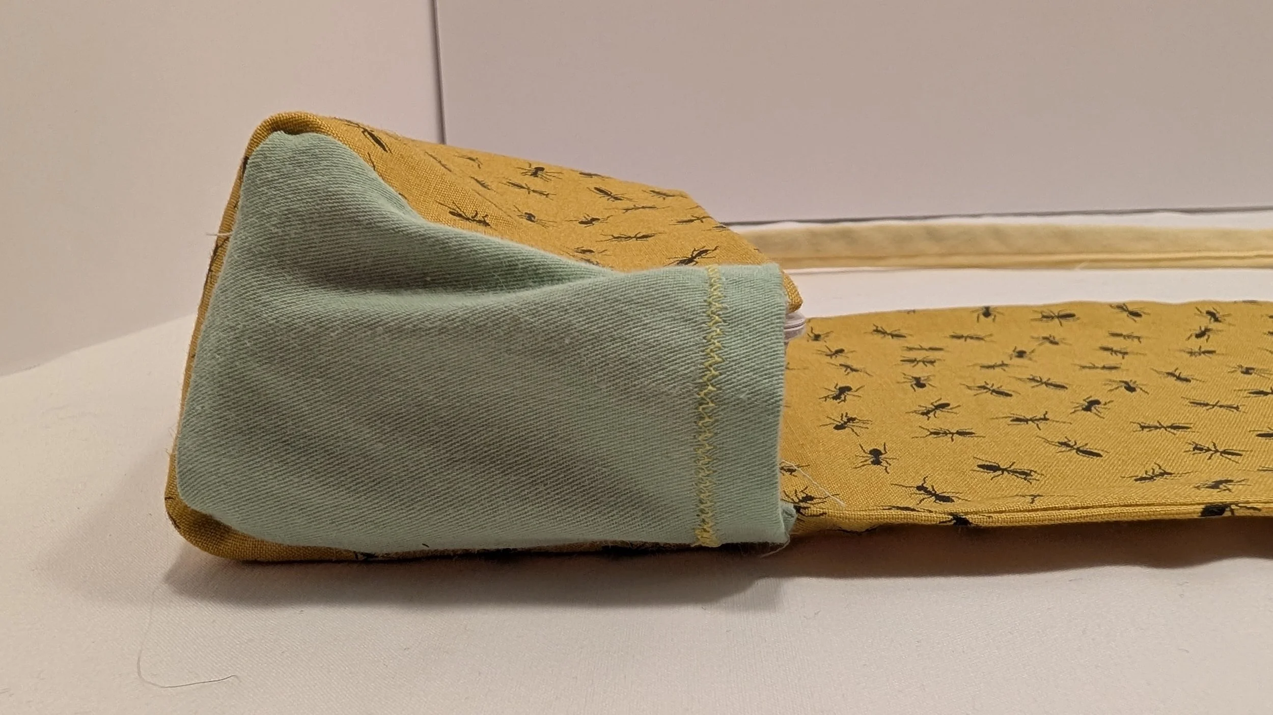 This standard size tarot deck holder is made of a fun yellow ant pattern on cotton. It features pastel cotton accent fabric. The deck holder has both a pocket to hold your deck and a space for a small spread. This deck holder is made to fit almost all standard size tarot or oracle decks.