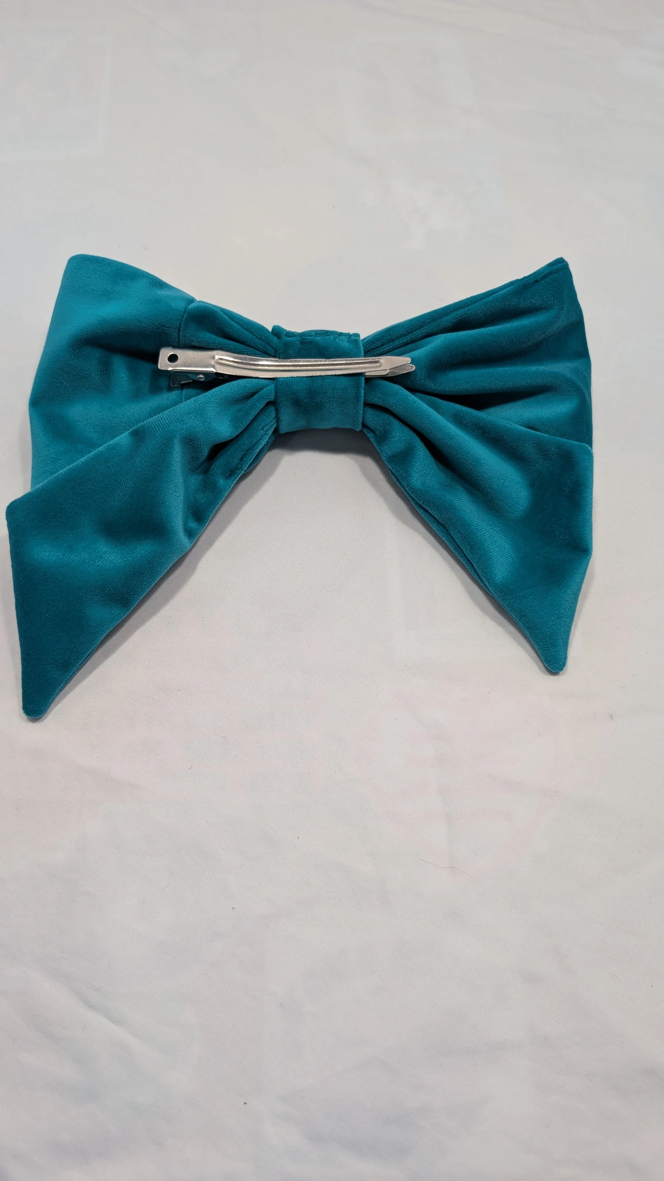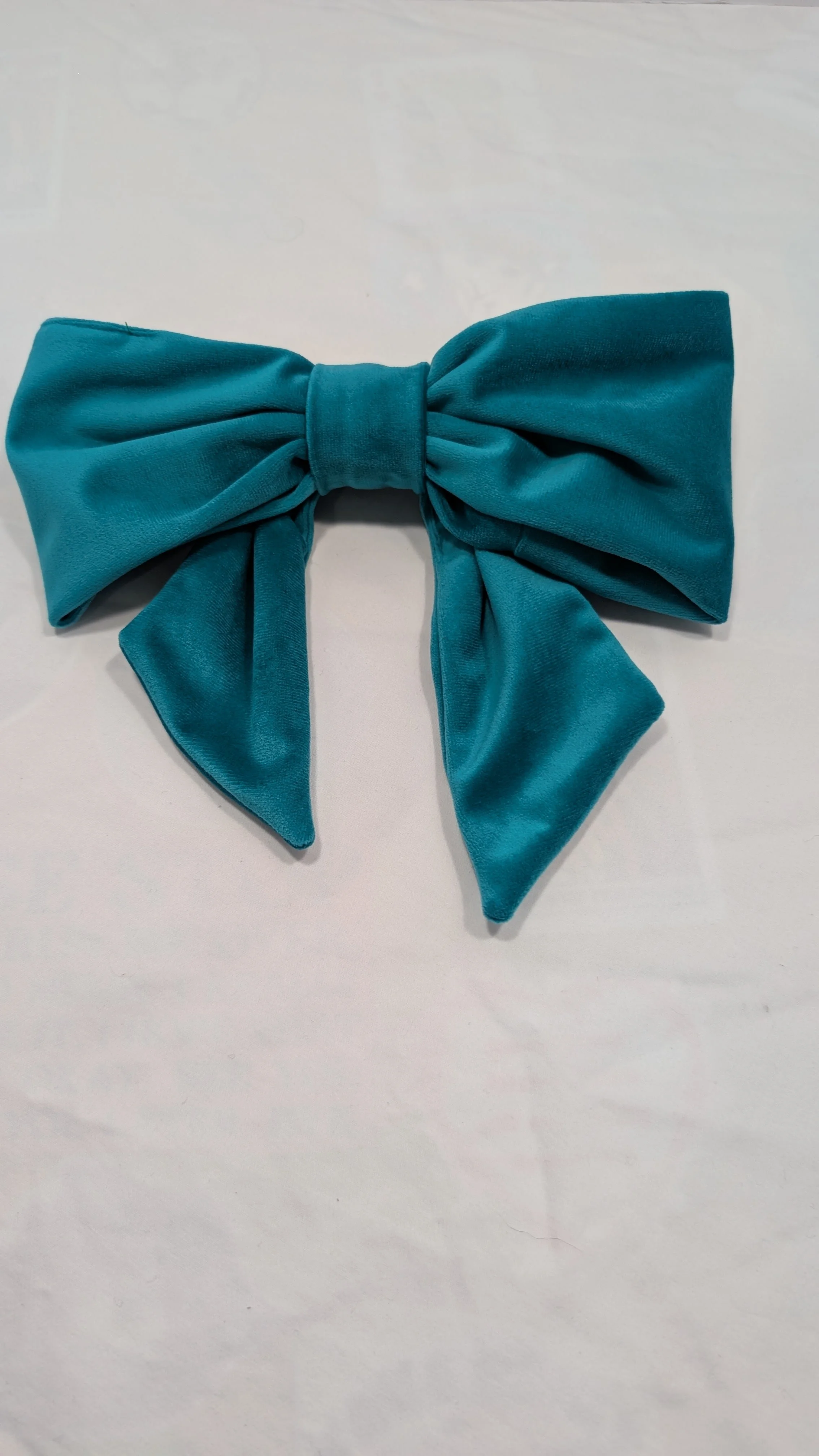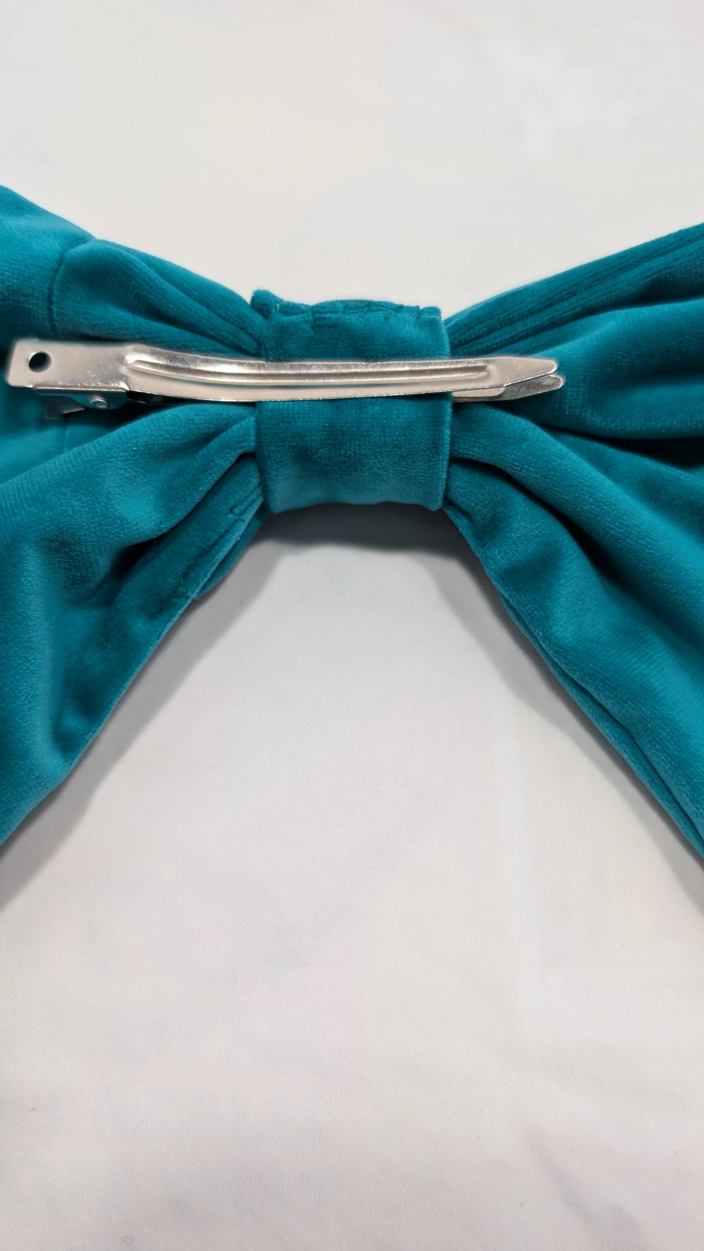 This green velvet hair bow is luxurious and soft. It uses a 3” salon clip to hold hair secure. The bow’s fabric is polyester based velvet and approximately 8” wide. The bow includes hand finishing details.