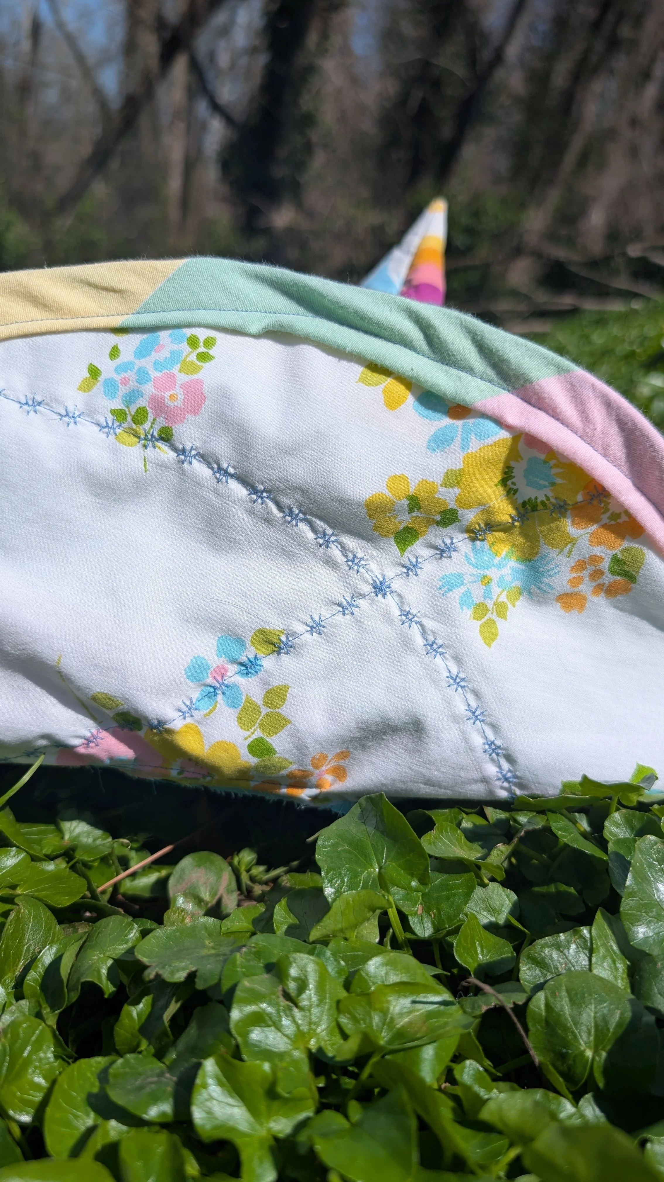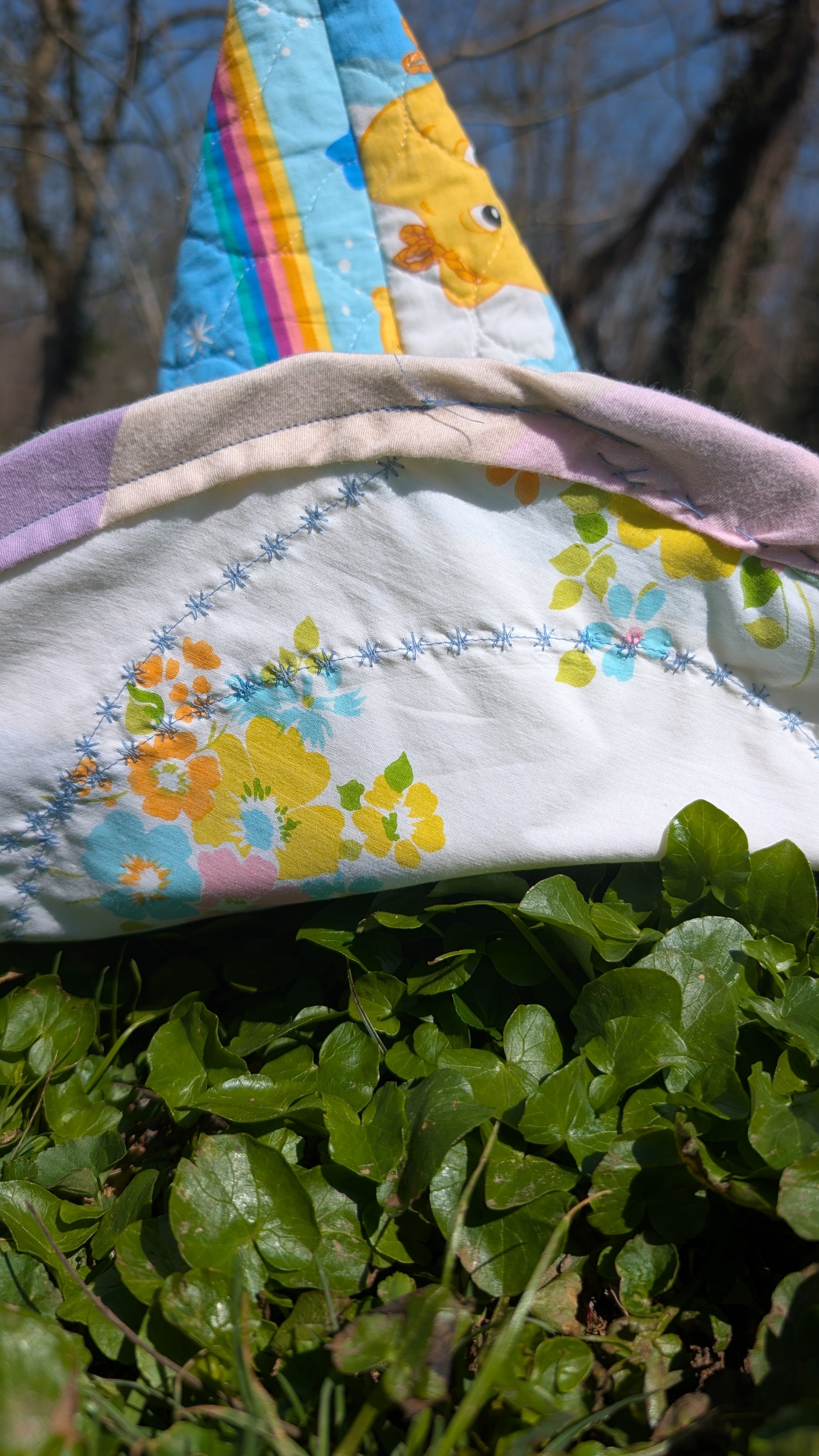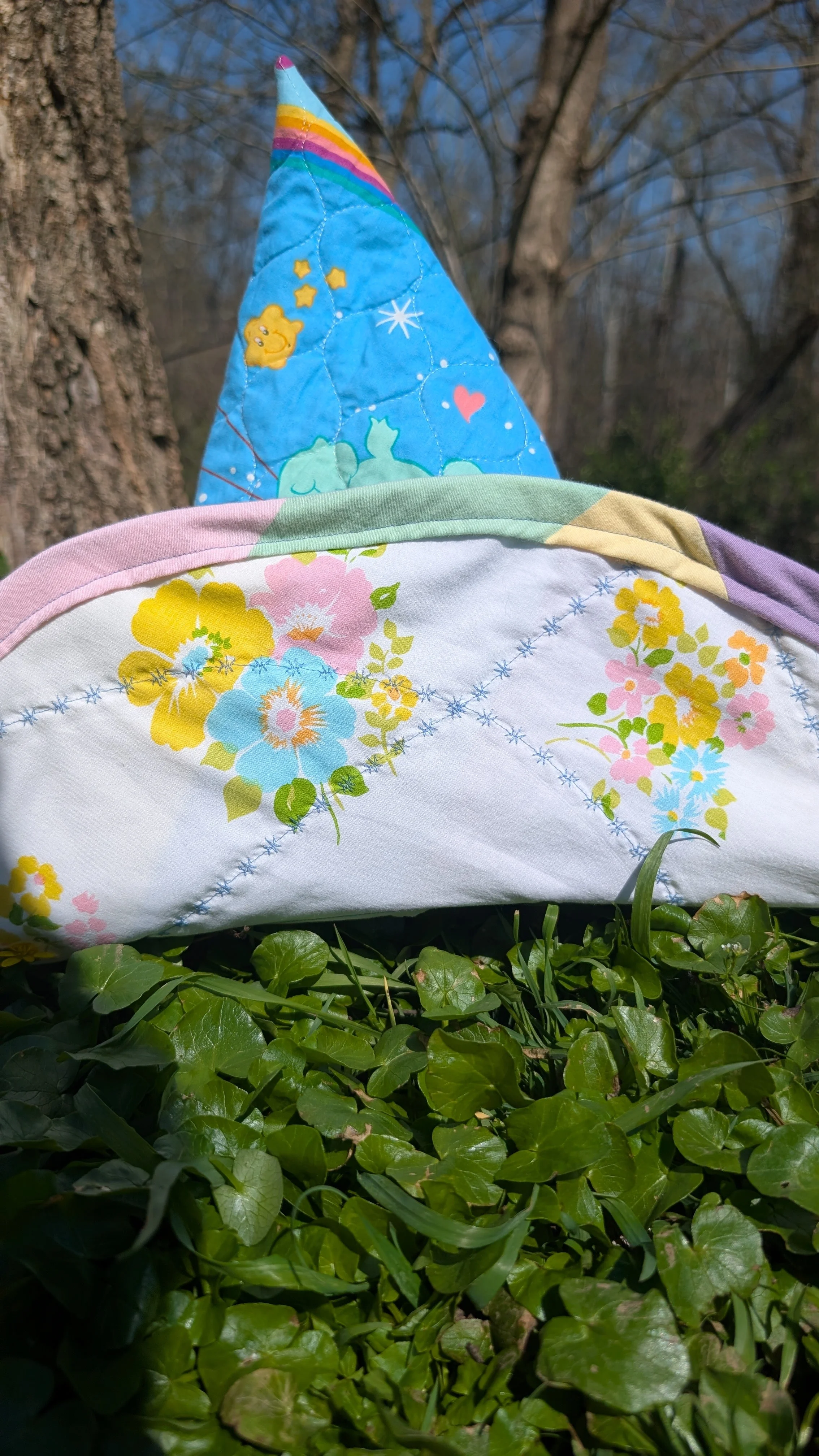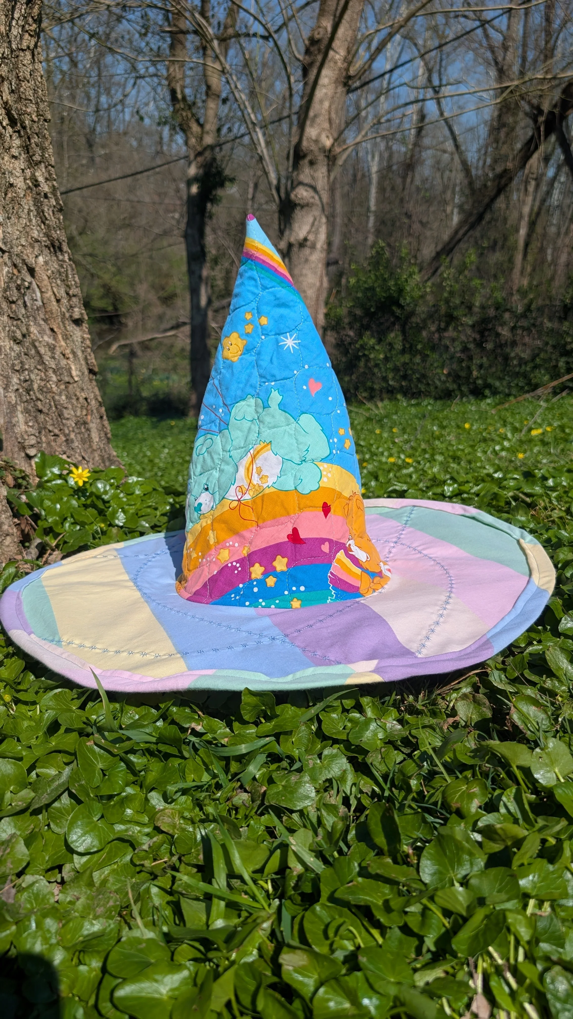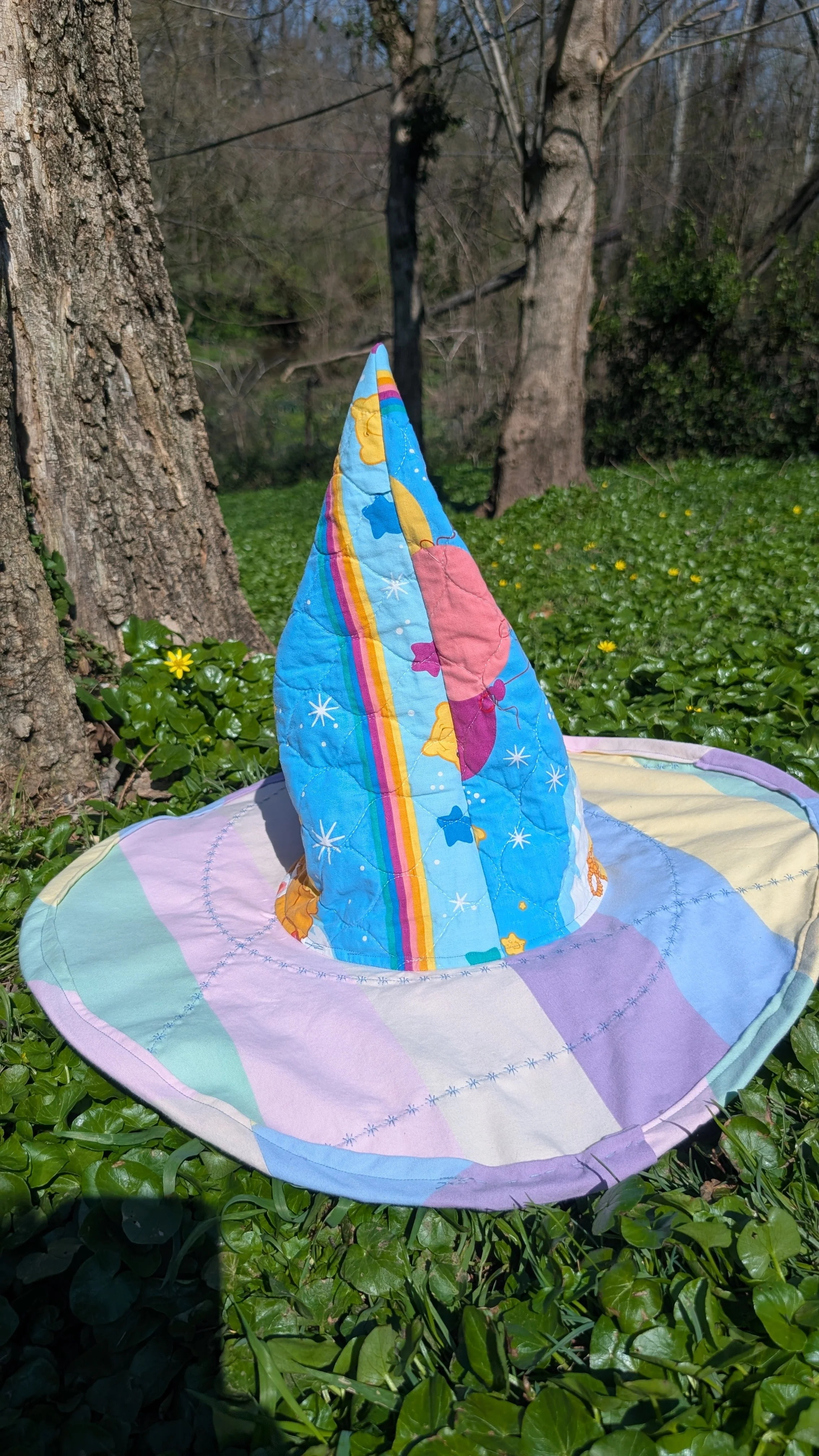 This one of a kind quilted witch hat has been upcycled from a Care Bears quilt and contains the Rainbow Trail design on the hat cone. The brim also features pastel striped fabric on the top and a floral pattern on the underside. More pastel stripes are used for the bias trim. Wire is added to the matching bias tape brim edging for structure. It can be gentley reshaped as needed for wear of storage. The hat is finished with hand stitched details.