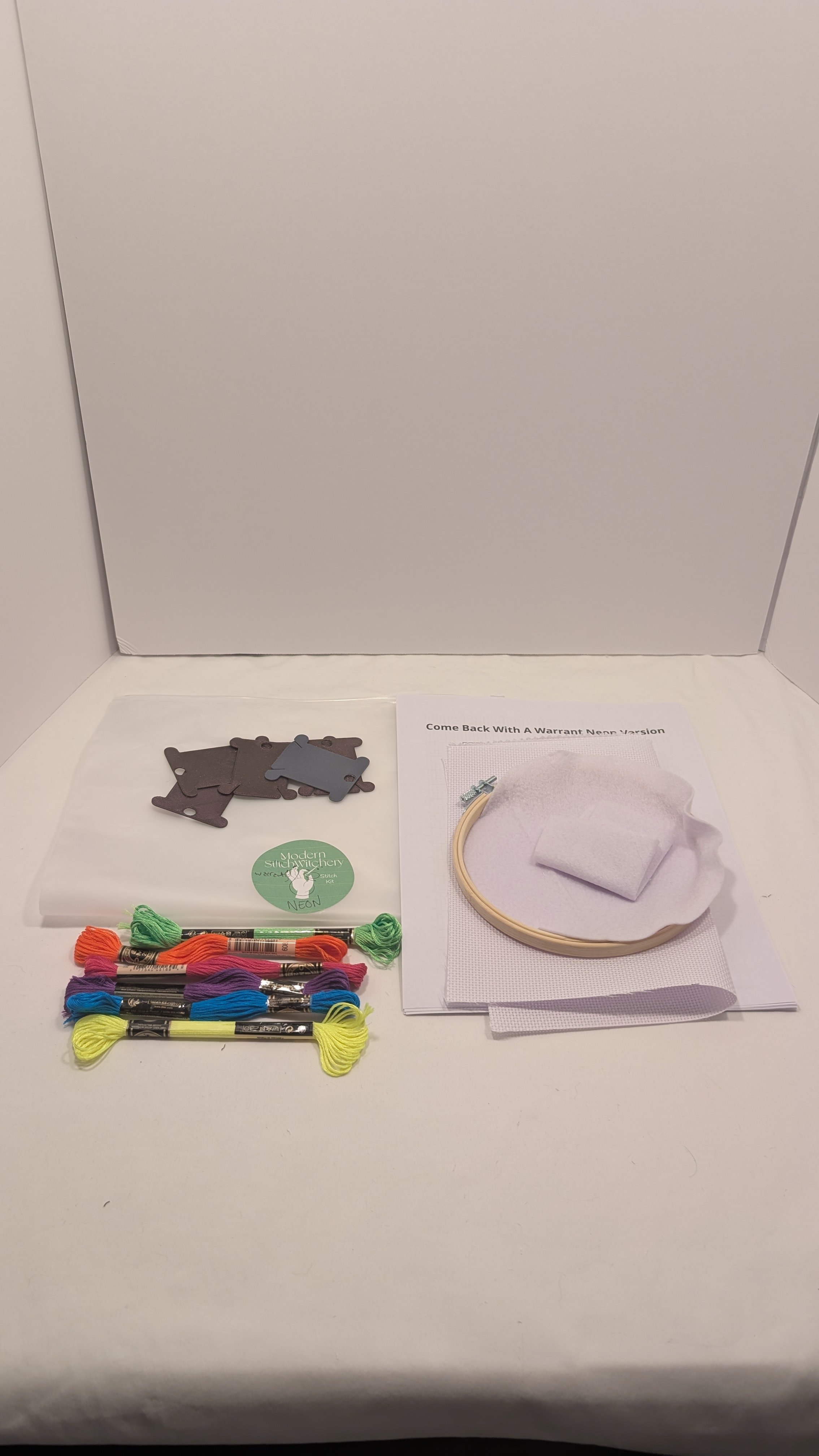 This is a kit to create your own Come Back With a Warrant - Neon Version Hoop Art in the 6 inch size. This stitch kit includes everything needed to complete the project. The kit includes: white Aida cloth, 6 inch embroidery hoop, cotton embroidery floss in all colors necessary to complete the project, paper copy of the pattern, dull cross stitch needle, 6 inch round felt, and embroidery floss spools for each color.